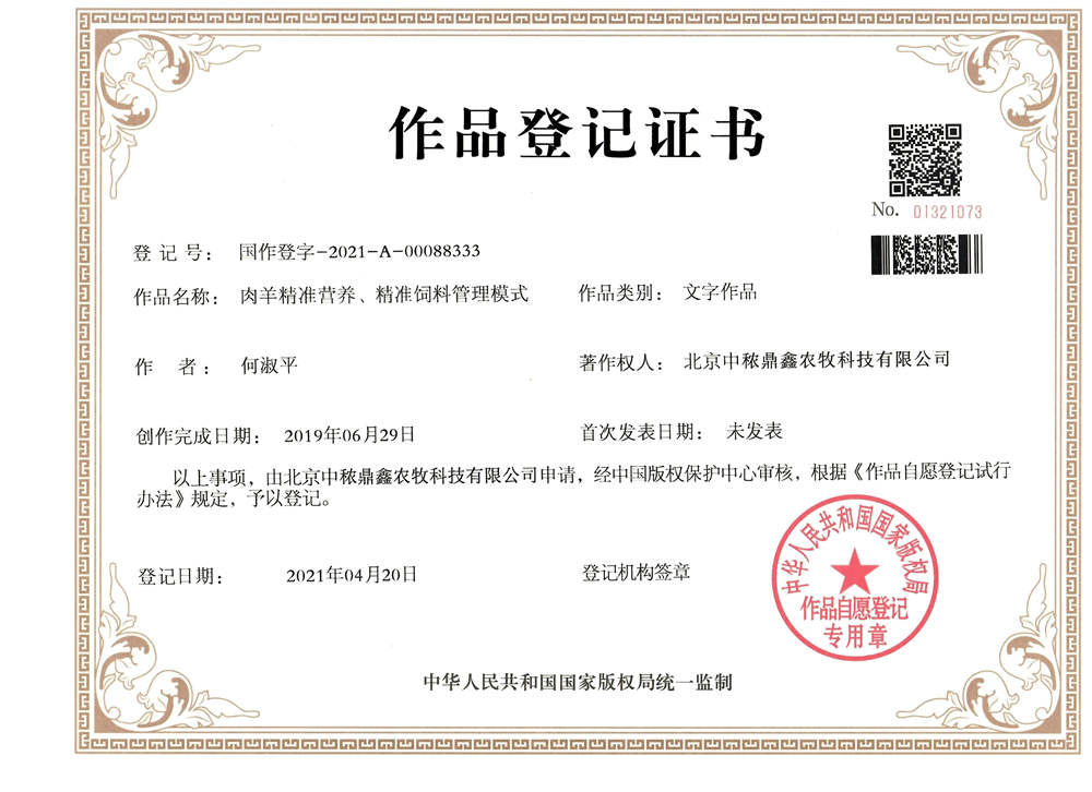 肉羊精準(zhǔn)營(yíng)養(yǎng)版權(quán)登記證書