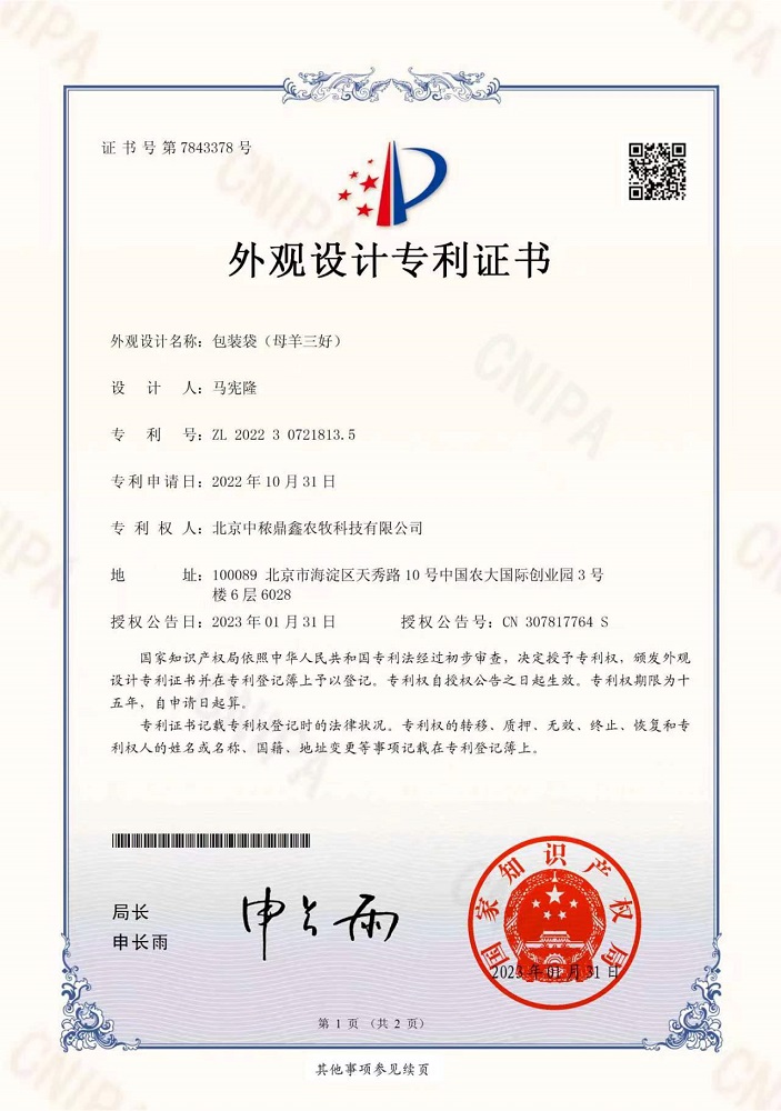 中秾牛羊禾外觀設(shè)計(jì)專利證書